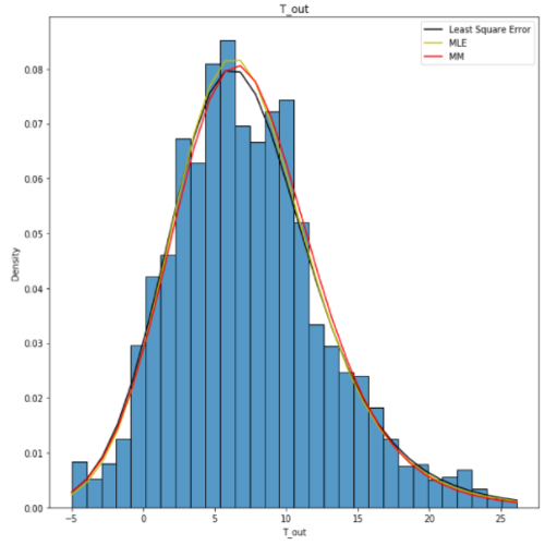In the figure, we can see an estimation of distribution to a random variable found by three methods, LSE, MLE, and MM.